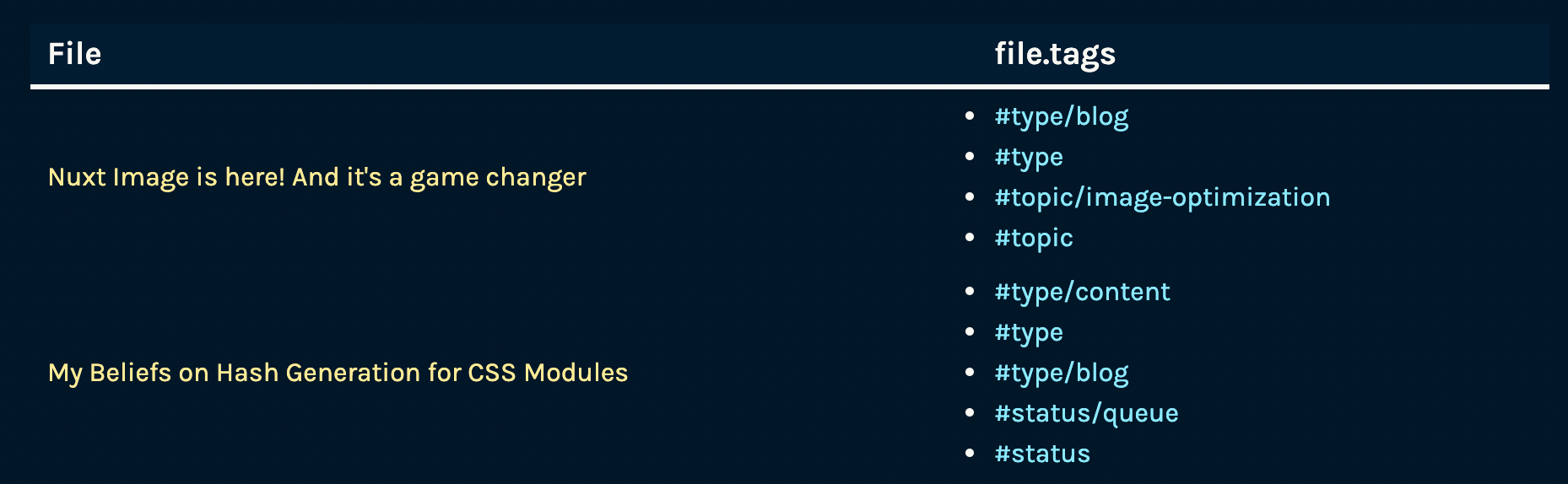 TABLE file.tags